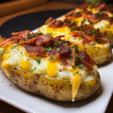 Crispy on the outside and fluffy within, these Baked Potatoes with Bacon and Cheese combine savory flavors, making them an ideal comfort food for any gathering.