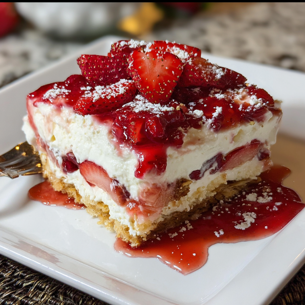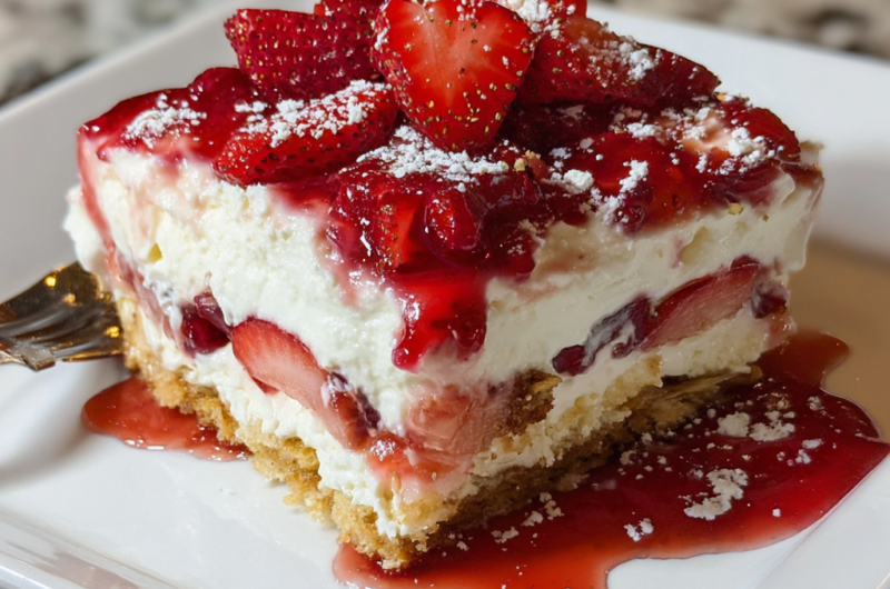 Perfect for potlucks, family gatherings, or casual weeknight treats, this recipe eliminates the need for baking, which means you can enjoy the sweet, creamy goodness without heating up your kitchen. With whipped cream, strawberries, and a rich cheesecake filling, each bite is a burst of flavor and texture that will make your taste buds dance.