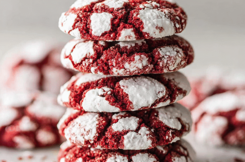 Red Velvet Crinkle Cookies are a festive twist on the classic cookie, merging the rich flavors of chocolate with the iconic red hue that defines red velvet cake. The invitingly soft texture and the signature powdered sugar coating create a delightful balance of taste and visual appeal.
