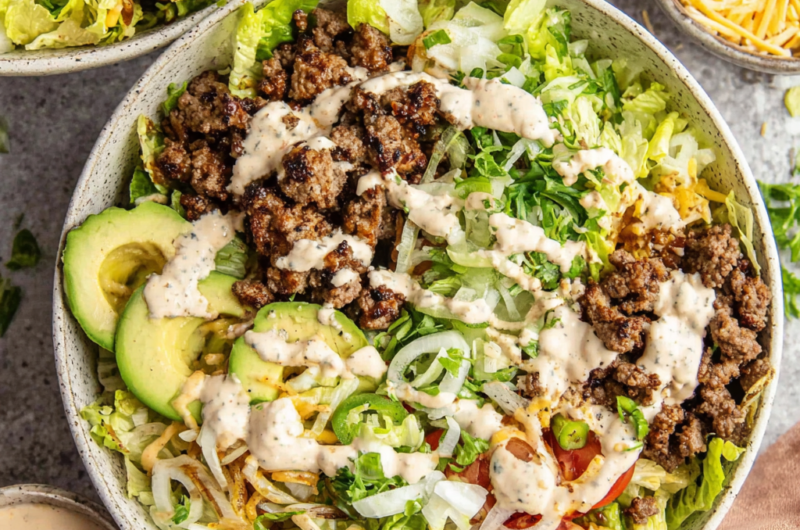 Savor the layers of juicy beef, fresh toppings, and zesty sauces in these Burger Bowls, a flavorful and satisfying meal ideal for any casual gathering.