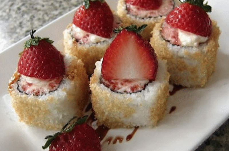 If you find the rolls are too sweet, reduce the sugar added to both the rice and the whipped cream. You can balance sweetness with the tartness of the strawberries, ensuring a well-rounded flavor.