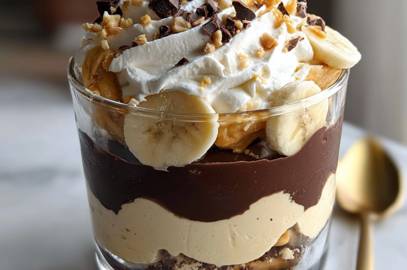 Creating this dessert might seem intricate, but it’s actually a straightforward process that yields stunning results. The layers of chocolate pudding, peanut butter mousse, and fresh banana slices not only create a feast for the eyes but also offer a variety of textures that will please any palate.