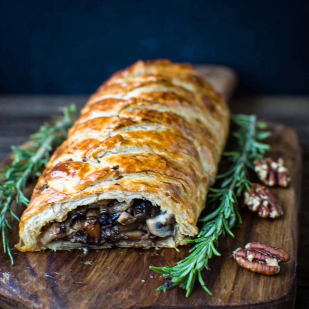 - Spoon the mushroom mixture in the center of the pastry, shaping it into a log.